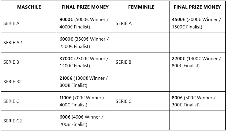 Un aspetto da non sottovalutare è il montepremi complessivo di 30.000 euro in buoni valore, suddivisi tra tutte le serie maschili e femminili. Un incentivo in più per le squadre che si contenderanno i titoli e un riconoscimento per l’impegno profuso durante la stagione.